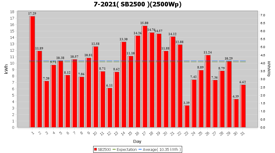 | 17-7-2021 | kWh | W/Wp | 15.80 | 2500 | 6.3 | 7.31 | £ 9.16 | 4.9 | |